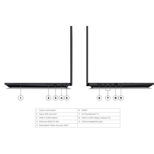 | Standartné porty | 1x USB-A (USB 5Gbps / USB 3.2 Gen 1) 1x USB-A (USB 5Gbps / USB 3.2 Gen 1), Always On 2x USB-C® (Thunderbolt™ 4 / USB4® 40Gbps), with USB PD 3.0 and DisplayPort™ 2.1 1x HDMI® 2.1, up to 4K/60Hz 1x Headphone / microphone combo jack (3.5mm) 1x Ethernet (RJ-45) 1x Security keyhole |