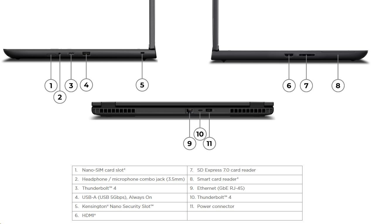 | Standartné porty | 1x USB-A (USB 5Gbps / USB 3.2 Gen 1), Always On 2x USB-C® (Thunderbolt™ 4 / USB4® 40Gbps), with USB PD 3.0 and DisplayPort™ 2.1 1x HDMI® 2.1, up to 8K/60Hz 1x Headphone / microphone combo jack (3.5mm) 1x Ethernet (RJ-45) 1x SD Express 7.0 card reader 1x Security keyhole |