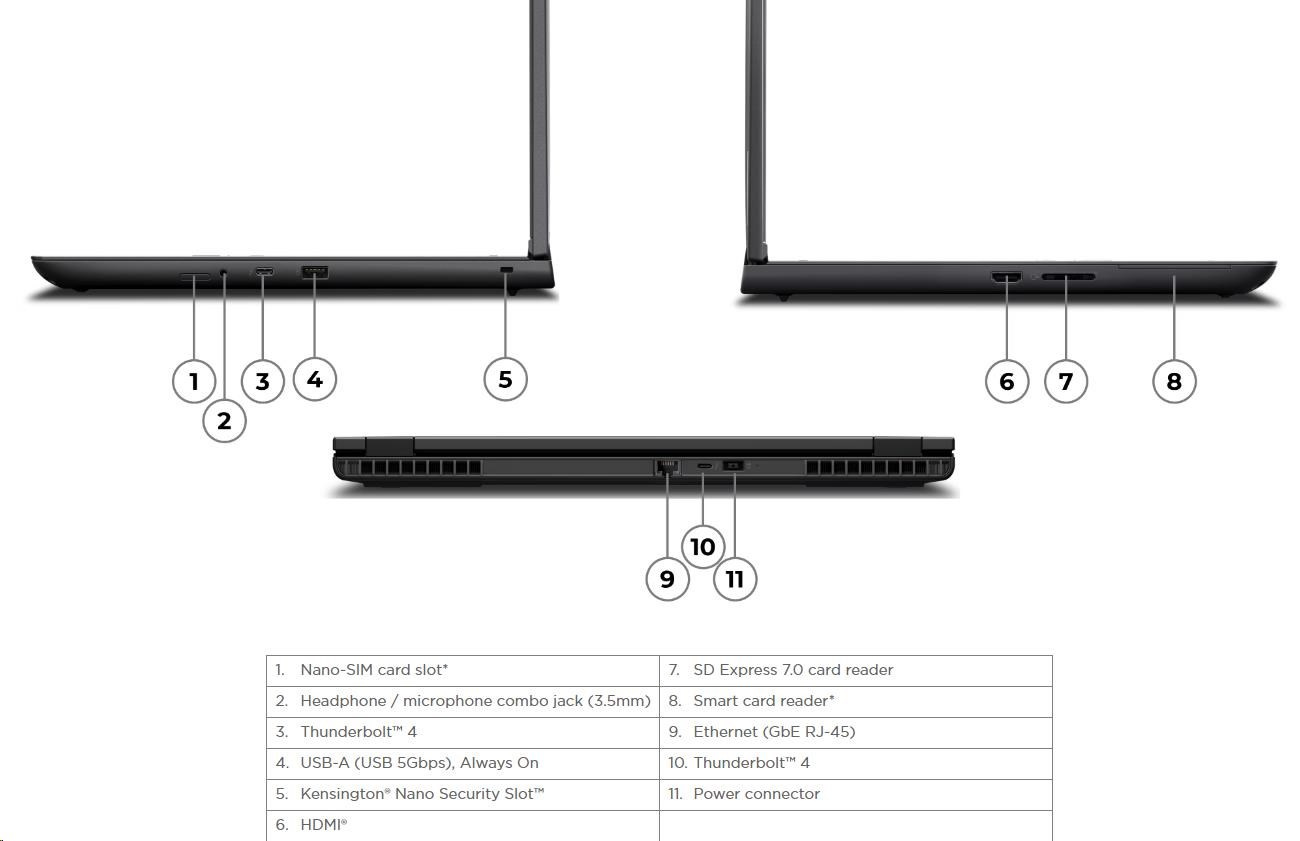 | Standartné porty | 1x USB-A (USB 5Gbps / USB 3.2 Gen 1), Always On 2x USB-C® (Thunderbolt™ 4 / USB4® 40Gbps), with USB PD 3.0 and DisplayPort™ 2.1 1x HDMI® 2.1, up to 8K/60Hz 1x Headphone / microphone combo jack (3.5mm) 1x Ethernet (RJ-45) 1x SD Express 7.0 card reader 1x Security keyhole |
