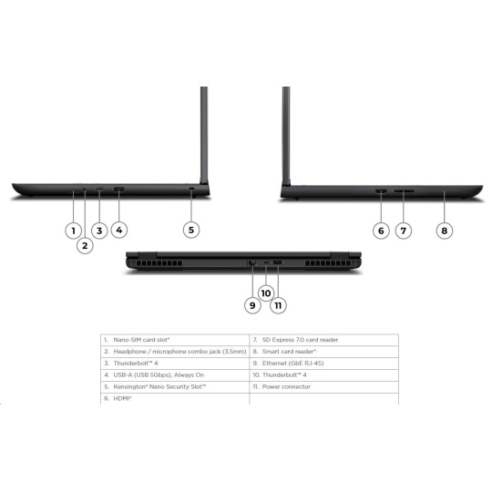 | Standartné porty | 1x USB-A (USB 5Gbps / USB 3.2 Gen 1), Always On 2x USB-C® (Thunderbolt™ 4 / USB4® 40Gbps), with USB PD 3.0 and DisplayPort™ 2.1 1x HDMI® 2.1, up to 8K/60Hz 1x Headphone / microphone combo jack (3.5mm) 1x Ethernet (RJ-45) 1x SD Express 7.0 card reader 1x Security keyhole |