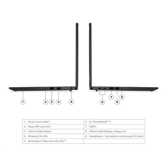 | Standartné porty | 1x USB-A (USB 5Gbps / USB 3.2 Gen 1) 1x USB-A (USB 5Gbps / USB 3.2 Gen 1), Always On 2x USB-C® (Thunderbolt™ 4 / USB4® 40Gbps), with USB PD 3.0 and DisplayPort™ 2.1 1x HDMI® 2.1, up to 4K/60Hz 1x Headphone / microphone combo jack (3.5mm) 1x Ethernet (RJ-45) 1x Smart Card Reader 1x Nano-SIM Card Slot |