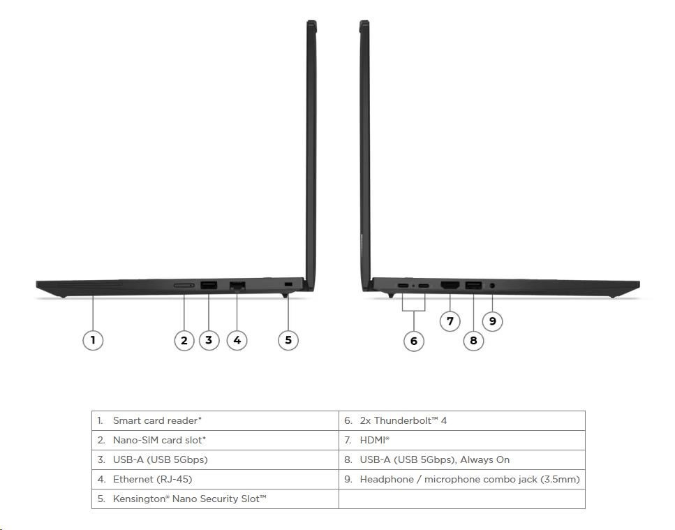 | Standartné porty | 1x USB-A (USB 5Gbps / USB 3.2 Gen 1) 1x USB-A (USB 5Gbps / USB 3.2 Gen 1), Always On 2x USB-C® (Thunderbolt™ 4 / USB4® 40Gbps), with USB PD 3.0 and DisplayPort™ 2.1 1x HDMI® 2.1, up to 4K/60Hz 1x Headphone / microphone combo jack (3.5mm) 1x Ethernet (RJ-45) 1x Smart Card Reader 1x Nano-SIM Card Slot |