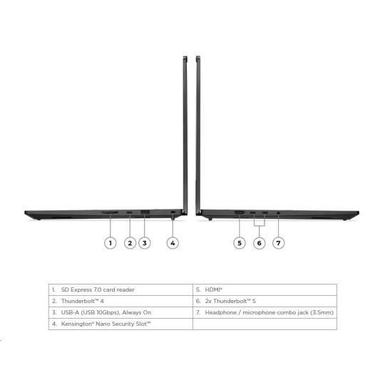 | Standartné porty | 1x USB-A (USB 10Gbps / USB 3.2 Gen 2), Always On 2x Thunderbolt™ 5, with USB PD 3.1 and DisplayPort™ 2.1, 140W input / 15W outpu 1x Thunderbolt™ 4, with DisplayPort™ 2.1 and USB PD 3.1, 140W input / 15W output 1x HDMI® 2.1, up to 8K/60Hz 1x Headphone / microphone combo jack (3.5mm) 1x SD Express 7.0 card reader |