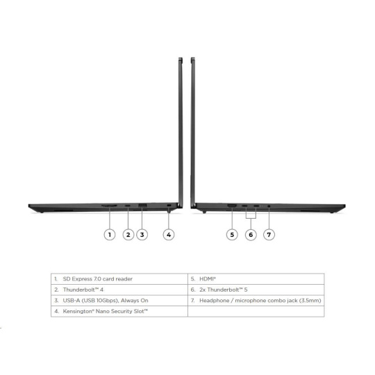 | Standartné porty | 1x USB-A (USB 10Gbps / USB 3.2 Gen 2), Always On 2x Thunderbolt™ 5, with USB PD 3.1 and DisplayPort™ 2.1, 140W input / 15W output 1x Thunderbolt™ 4, with DisplayPort™ 2.1 and USB PD 3.1, 140W input / 15W output 1x HDMI® 2.1, up to 8K/60Hz 1x Headphone / microphone combo jack (3.5mm) 1x SD Express 7.0 card reader |