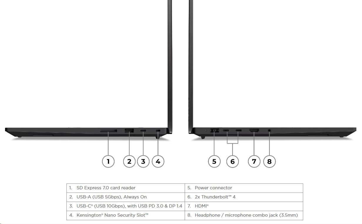 2x USB-C® (Thunderbolt™ 4 / USB4® 40Gbps), with USB PD 3.0 (135W input) and DisplayPort™ 2.1