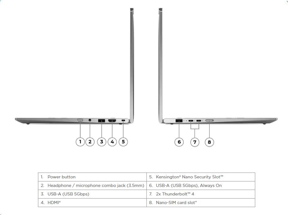 | Štandardné porty | 1x USB-A (USB 5Gbps / USB 3.2 Gen 1) 1x USB-A (USB 5Gbps / USB 3.2 Gen 1), Always On 2x USB-C® (Thunderbolt™ 4 / USB4® 40Gbps), s USB PD 3.0 a DisplayPort™ 2.1 1x HDMI® 2.1, až 4K/60Hz 1x slúchadlový / mikrofónový combo jack (3,5 mm) |