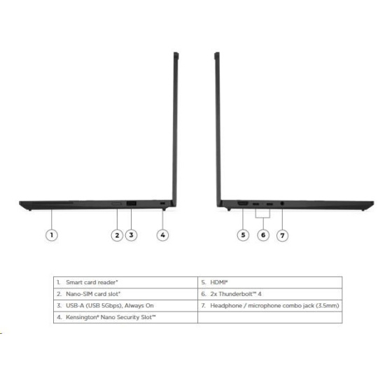 | Standartné porty | 1x USB-A (USB 5Gbps / USB 3.2 Gen 1), Always On 2x USB-C® (Thunderbolt™ 4 / USB4® 40Gbps), with USB PD 3.0 and DisplayPort™ 2.1 1x HDMI® 2.1, up to 4K/60Hz 1x Headphone / microphone combo jack (3.5mm) |