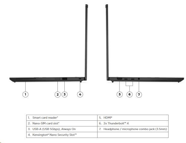 | Standartné porty | 1x USB-A (USB 5Gbps / USB 3.2 Gen 1), Always On 2x USB-C® (Thunderbolt™ 4 / USB4® 40Gbps), with USB PD 3.0 and DisplayPort™ 2.1 1x HDMI® 2.1, up to 4K/60Hz 1x Headphone / microphone combo jack (3.5mm) |