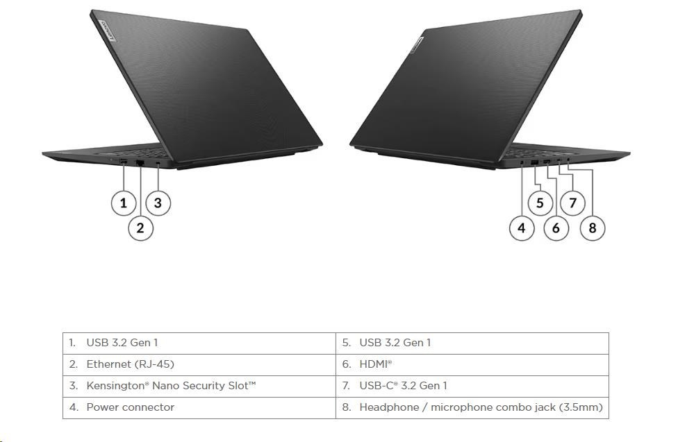 | Standartné porty | 2x USB 3.2 Gen 1 1x USB-C® 3.2 Gen 1 (support data transfer, Power Delivery (20V only) and DisplayPort™ 1.2) 1x HDMI® 1.4b 1x Headphone / microphone combo jack (3.5mm) 1x Ethernet (RJ-45) 1x Power connector |