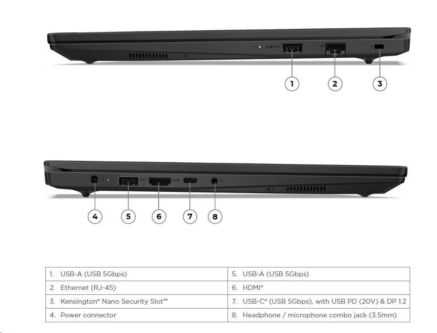 | Štandardné porty | 2x USB-A (USB 5Gbps / USB 3.2 Gen 1) 1x USB-C® (USB 5Gbps / USB 3.2 Gen 1), s USB Power Delivery (len 20V) a DisplayPort™ 1.2 1x HDMI® 1.4b 1x Combo jack pre slúchadlá / mikrofón (3.5mm) 1x Ethernet (RJ-45) 1x Napájací konektor |