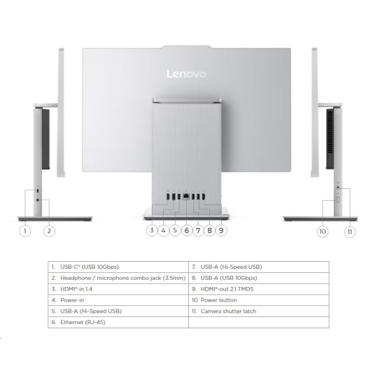 | Standartné porty | 1x USB-A (USB 10Gbps / USB 3.2 Gen 2) 2x USB-A (Hi-Speed USB / USB 2.0) 1x HDMI®-in 1.4 1x HDMI®-out 2.1 TMDS 1x Ethernet (RJ-45) 1x power connector 1x USB-C® (USB 10Gbps / USB 3.2 Gen 2), data transfer only 1x headphone / microphone combo jack (3.5mm) |