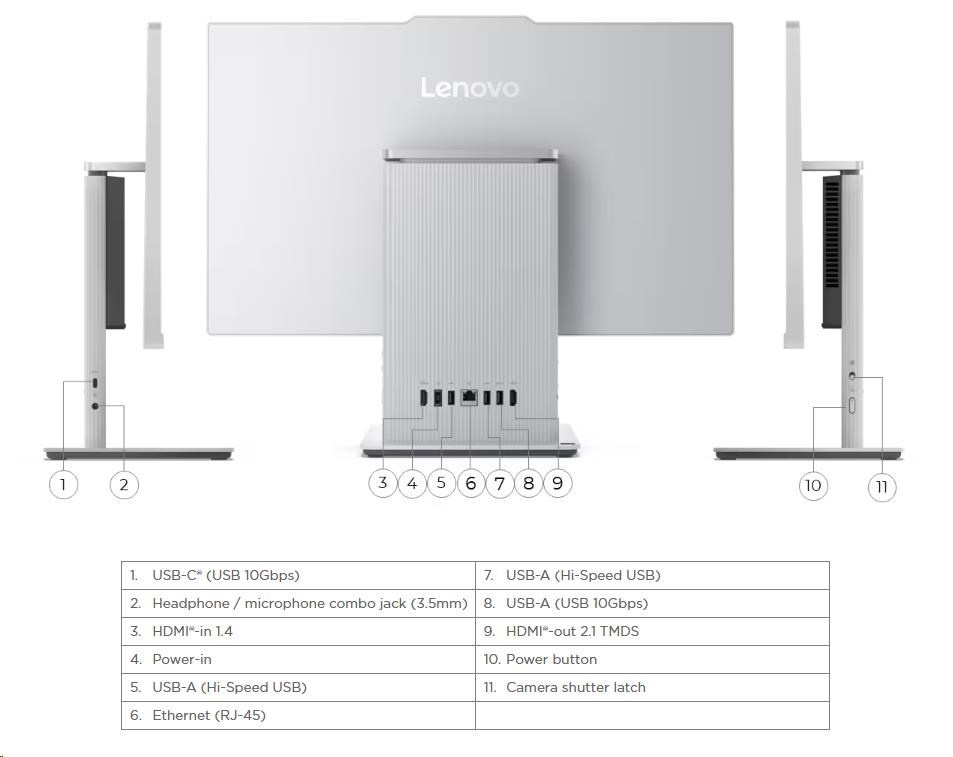 | Standartné porty | 1x USB-A (USB 10Gbps / USB 3.2 Gen 2) 2x USB-A (Hi-Speed USB / USB 2.0) 1x HDMI®-in 1.4 1x HDMI®-out 2.1 TMDS 1x Ethernet (RJ-45) 1x power connector 1x USB-C® (USB 10Gbps / USB 3.2 Gen 2), data transfer only 1x headphone / microphone combo jack (3.5mm) |