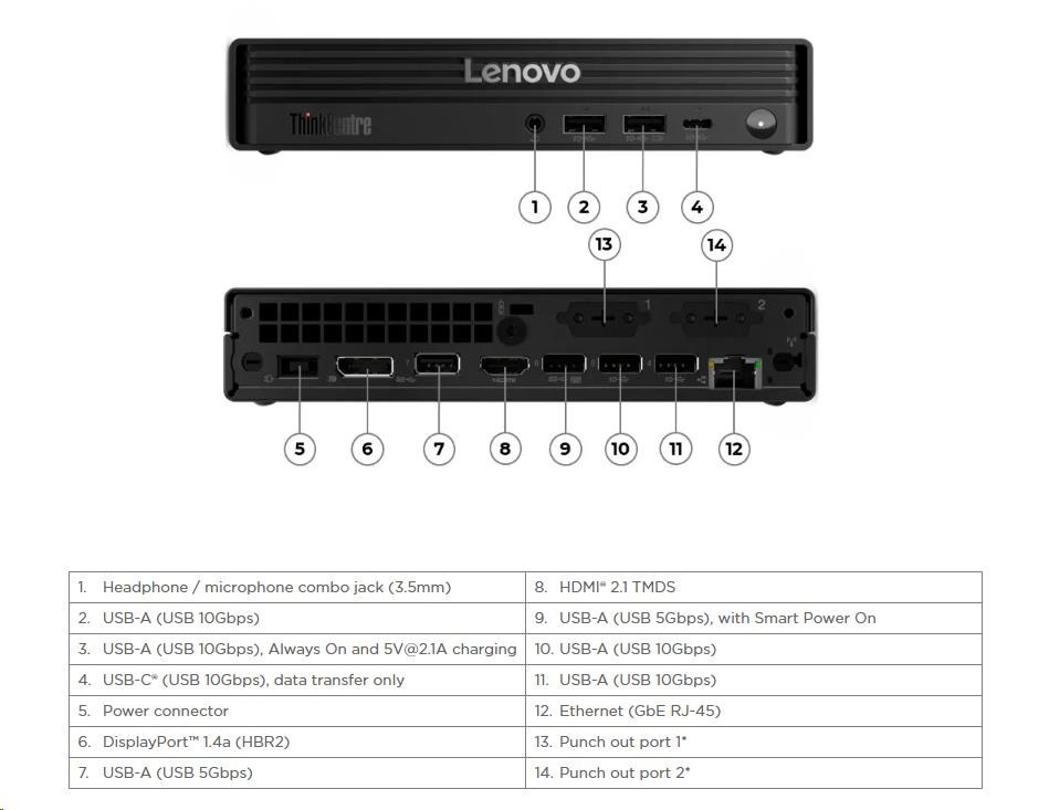 | Predné porty | 1x USB-C® (USB 10Gbps / USB 3.2 Gen 2), data transfer only 2x USB-A (USB 10Gbps / USB 3.2 Gen 2), one supports Always On and 5V@2.1A charging 1x headphone / microphone combo jack (3.5mm) |