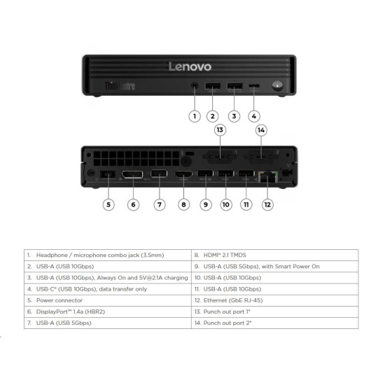 | Predné porty | 1x USB-C® (USB 10Gbps / USB 3.2 Gen 2), data transfer only 2x USB-A (USB 10Gbps / USB 3.2 Gen 2), one supports Always On and 5V@2.1A charging 1x headphone / microphone combo jack (3.5mm) |
