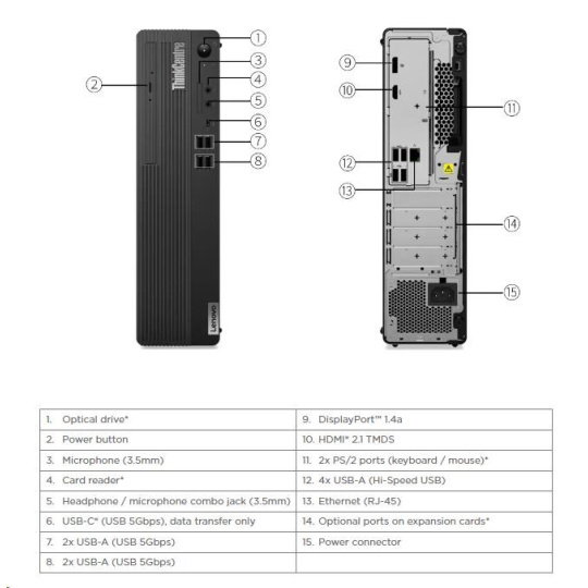 | Predné porty | 1x USB-C® (USB 5Gbps / USB 3.2 Gen 1), with 15W charging 4x USB-A (USB 5Gbps / USB 3.2 Gen 1) 1x headphone / microphone combo jack (3.5mm) 1x microphone (3.5mm) |