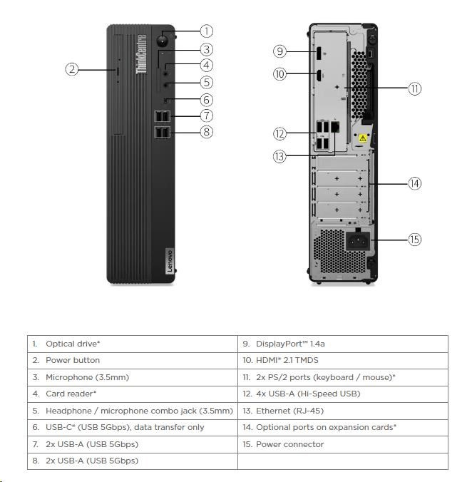 | Predné porty | 1x USB-C® (USB 5Gbps / USB 3.2 Gen 1), with 15W charging 4x USB-A (USB 5Gbps / USB 3.2 Gen 1) 1x headphone / microphone combo jack (3.5mm) 1x microphone (3.5mm) |