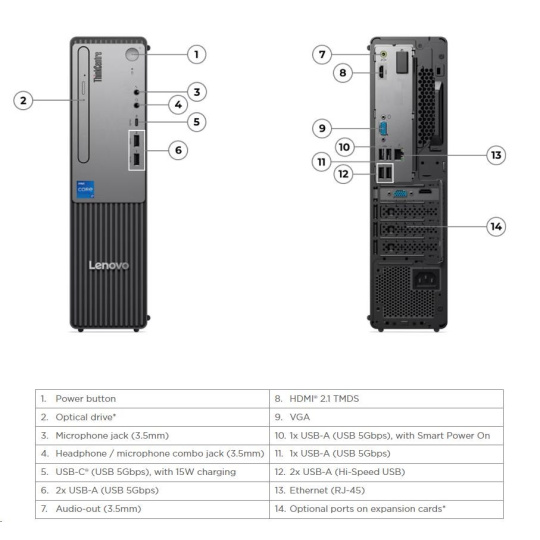 | Zadné porty | 2x USB-A (Hi-Speed USB / USB 2.0) 2x USB-A (USB 5Gbps / USB 3.2 Gen 1), one supports Smart Power On 1x HDMI® 2.1 TMDS 1x VGA 1x Ethernet (RJ-45) 1x line-out (3.5mm) |