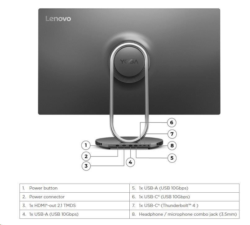 | Standartné porty | 1x Thunderbolt™ 4 1x USB-C® (USB 10Gbps / 3.2 Gen 2) 2x USB-A (USB 10Gbps / USB 3.2 Gen 2) 1x HDMI®-out 2.1 TMDS 1x headphone / microphone combo jack (3.5mm) 1x power connector |
