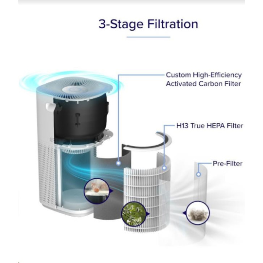 Druhou vrstvou je HEPA filter H13. Tým sa Levoit odlišuje od konkurencie, pretože filter HEPA H13 je oveľa kvalitnejší a spoľahlivejší ako bežne používaný HEPA H11. Tu sa odfiltrujú jemné prachové častice, plesne, baktérie, peľ, častice dymu, roztoče a srsť.