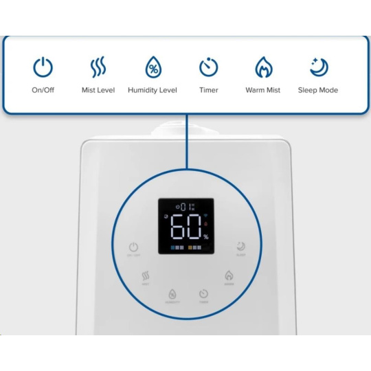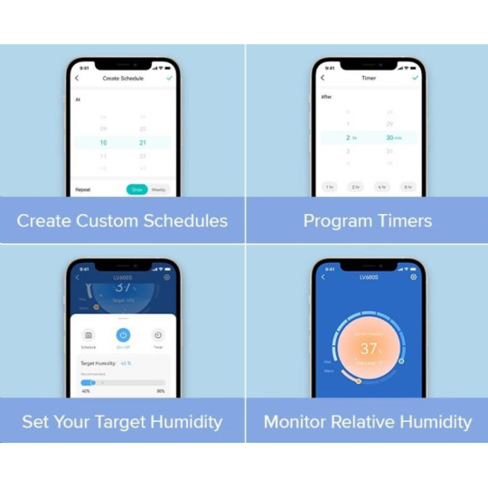 Zvlhčovač vzduchu Levoit LV600S Smart je možné ovládať priamo na prehľadnom podsvietenom LED displeji alebo aj cez aplikáciu na chytrých zariadeniach Apple alebo Android. Alebo si ho môžete dokonca pripojiť do svojho Smart Home a ovládať hlasom cez Google Assistant alebo Amazon Alexa. Senzor vlhkosti zobrazuje vlhkosť v reálnom čase av automatickom režime tak okamžite reaguje na zmeny vlhkosti. Vždy by sa malo jednať o rozmedzie medzi 40 % až 60 %. Cez aplikáciu si môžete informácie kontrolovať alebo si svoje režimy plánovať.