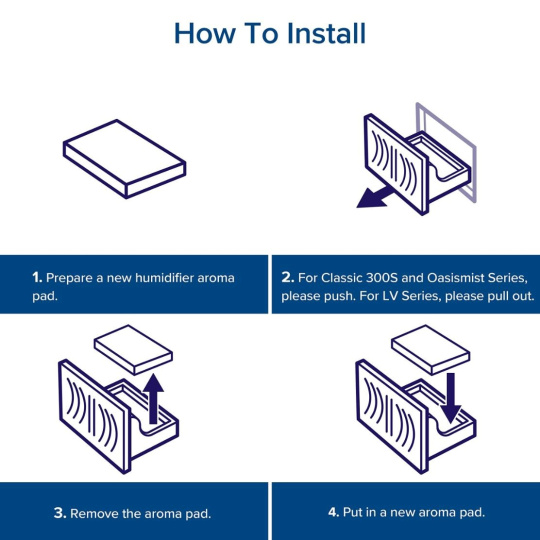 Vankúšiky na použitie esenciálnych olejov na aromaterapiu so zvlhčovačmi vzduchu Levoit. Odporúčame meniť aromatické vankúšiky v závislosti od frekvencie používania. Do zásobníka na vodu ani do základnej komory nepridávajte esenciálne oleje ani iné vonné látky. Esenciálne oleje pridávajte len do aromatických vankúšikov.
