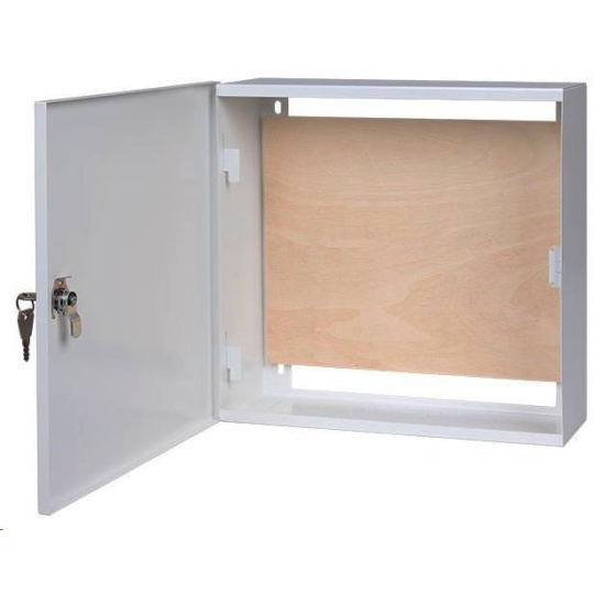 Lexi-Net Basic univerzálna skrinka 300 x 300 x 100 mm, biela Univerzálna uzamykateľná skrinka, povrchová montáž rozmer 300x300x100mm materiál oceľ 0,8mm s práškovou farbou - biela Montážna doska - preglejka 290 x 230 x 8mm Rozmer balenia 305x310x105 hmotnosť netto / s obalom 1,6kg / 1,72kg Krytie IP20..