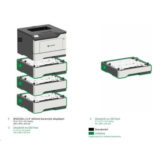 Všeobecné špecifikácie Číslo dielu 36S0310 Monochromatická laserová tlač Technológia Veľkosť pracovnej skupiny Stredná pracovná skupina Displej 2,4" (60 mm) farebný LCD displej Podporované veľkosti médií A6, Oficio, 7 3/4 obálky, 9 obálky, JIS-B5, A4, Legal, A5, Letter, Statement, Executive, Universal, DL obálka, Folio, 10 obálka Manipulácia s papierom Súčasťou balenia je viacúčelový podávač na 100 listov, integrovaný duplex, výstupný zásobník na 150 listov, integrovaný zásobník na 250 listov Štandardné porty Gigabit Ethernet (10/100/1000), port USB 2.0 Špecifikácia Hi-Speed Certified (Type B) Rozmery (V x H x Š) 260 x 399 x 374 mm Hmotnosť 14.1 kg Rozmery balenia (v x h x š) 376 x 430 x 470 mm Hmotnosť balenia 15.99 kg Tlač Rýchlosť tlače 44 str./min.1 Rýchlosť obojstrannej tlače) Až: čiernobielo: 22 str./min. (A4) Čas prvej čiernobielej strany: 6.0 sekúnd Rozlíšenie čiernobielej tlače: 1200 x 1200 dpi, kvalita 2400, 300 x 300 dpi, 600 x 600 dpi, kvalita 1200 Obojstranná obojstranná tlač: integrovaná obojstranná tlačová plocha 4.0 mm od všech okrajů (včetně) Manipulace s papírem Podporované typy médií Papírové štítky, Tvrdý papír, Obyčejný papír, Transparencies, Envelopes, vinylové štítky, viz Card Stock & Label Guide Možnost dokončování No Počet vstupů papíru standardně: 2 maximálně: 5 Kapacita vstupu papíru standardně: 350 stránek maximálně: 2000 stránek 350 stránek Kapacita výstupu papíru Až: standardně: 150 stránek maximálně: 150 stránek Podporovaný rozsah gramáže papíru 60 - 120 g/m2 (standardní zásobník) 60 - 216 g/m2 (multifunkční zásobník) Doporučený měsíční objem tisku 2000 - 15000 stránek2 Maximální měsíční funkční cyklus 120000 stránek za měsíc3 Kazety a zobrazování Počty vytištěných stránek u kazet pro tiskárny až: 15,0004 -page High Yield Cartridge Kazeta na 6 0004 stran Extra vysokokapacitní kazeta na 20 0004 stran Ultra vysokokapacitní kazeta na 25 0004 stran Odhadovaný počet vytištěných stránek na zobrazovací válec M: 60000 strán pri tlači 3 normálnych strán/A4 na tlačovú úlohu a pri 5 % pokrytí5 Tlačové kazety dodávané s výrobkom Prvá tonerová kazeta na 5 0000 strán, zahrnutá vo vratnom programe Náhradné kazety: Výrobok funguje len s náhradnými kazetami určenými na použitie v konkrétnej zemepisnej oblasti. Pozri www.lexmark.com/regions, kde nájdete ďalšie podrobnosti. Hardvér Procesor 1.0 GHz MHz Pamäť štandardná: 512 MB maximálna: 512 MB Pevný disk nie je k dispozícii Tlačový jazyk štandardný: PCL 5e Emulácia, PCL 6 Emulácia, Microsoft XPS (XML Paper Specification), Personal Printer Data Stream (PPDS), PostScript 3 Emulácia, PDF 1.7 emulácia, Direct Image, AirPrint™ Písma a znakové sady 2 bitmapové písma PCL, OCR-A, OCR-B škálovateľné písma PCL 5e, Ďalšie informácie nájdete v Technickej referencii., 84 škálovateľných písiem PCL, 91 škálovateľných písiem PostScript, 3 z 9 škálovateľných písiem PCL 5e v úzkej, bežnej a širokej verzii, 5 bitmapových písiem PPDS, 39 škálovateľných písiem PPDS Dotykový displej Nie Možnosti pripojenia Priame USB Nie Ethernet Áno Bezdrôtové bezdrôtové príslušenstvo Podpora sieťových protokolov TCP/IP IPv6, TCP/IP IPv4, AppleTalk™, TCP, UDP Metódy sieťovej tlače LPR/LPD, Pull Printing, Microsoft Web Services WSD, Secure IP (Port 96xx), FTP, TFTP, Enhanced IP (Port 9400), ThinPrint .integrácia tlače, IPP 1.0, 1.1, 2.0 (Internet Printing Protocol) Protokoly správy siete DHCP, APIPA (AutoIP), mDNS, IGMP, WINS, DDNS, SNMPv3, SNMPv1, SNMPv2c, Telnet, NTP, ICMP, HTTP, DNS, ARP, HTTP (SSL6 /TLS), Finger Zabezpečenie siete SNMPv3, 802.1x Autentifikácia: MD5, MSCHAPv2, LEAP, PEAP, TLS, TTLS Voliteľné sieťové porty Marknet N8370 WiFi Option Podporované operačné systémy Podporované operačné systémy Microsoft Windows Windows 10, Windows 8.1, Windows 8, Windows 8 x64, Windows 7 x64, Windows 8.1 x64, Windows 7 Podporované operačné systémy Apple Apple OS X (10.6, 10.7, 10.8, 10.9, 10.10, 10.11, 10.12) Podporované operačné systémy Linux Debian GNU/Linux 7.0, 8.0, Ubuntu 16.04 LTS, Fedora 23, 24, openSUSE Linux 42.3, Red Hat Enterprise Linux WS 6, 7, openSUSE Linux 13.2, SUSE Linux Enterprise Server 10, 11, 12 Citrix MetaFrame Microsoft Windows 2000 Server s terminálovými službami s prezentačným serverom Citrix MetaFrame XP alebo Citrix MetaFrame Presentation Server 3.0., Microsoft Windows Server 2012 s aplikáciou Citrix XenApp 6.0, 6.5, Microsoft Windows 2000 Server s terminálovými službami a Citrix Presentation Server 3.0, 4.0, Microsoft Windows 2000 Server s terminálovými službami a Citrix Presentation Server 4.0 Podporované operačné systémy Novell Novell Open Enterprise Server na SUSE Linux Enterprise Server, Novell NetWare 5.1(SP 6+), 6.0(SP 3+) s Novell Distributed Print Services (NDPS), Novell Open Enterprise Server 2 SP2 na SuSE Linux Enterprise Server 10 SP3 3, Novell NetWare 6.5 Open Enterprise Server, Novell Open Enterprise Server 11 na SUSE Linux Enterprise Server 11, Novell Open Enterprise Server 2 na SUSE Linux Enterprise Server 10 SP4 Podporované operačné systémy UNIX Sun Solaris x86 10, 11, Sun Solaris SPARC 10, 11, IBM AIX 6.1, 7.1 Elektrická energia a prevádzka ENERGY STAR Áno Typická spotreba energie podľa Energy Star 1.8 kilowatthodín týždenne Hlučnosť / Hladina hluku v prevádzke 14 dB (Idle) 56 dB (Print) Hladina hluku v pracovnom režime obojstrannej tlače: 55 dB Priemerná spotreba energie v režime hibernácie / Priemerná spotreba energie v režime spánku / Priemerná spotreba energie v režime Ready / Priemerná spotreba energie pri tlači 0.1 watt 2.0 wattov 8 wattov 620 wattov Predpísané prevádzkové podmienky Vlhkosť: 8 až 80 % relatívnej vlhkosti Teplota: 16 až 32 °C Nadmorská výška: 0 až 5000 metrov C