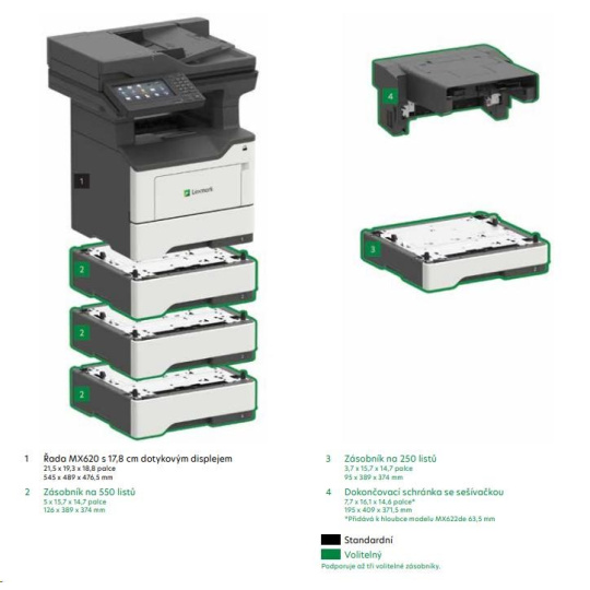 Obsah balenia Karta so stabilnými a bezpečnostnými údajmi alebo brožúra Informácie o programe Lexmark Cartridge Collection Multifunkčná laserová tlačiareň Lexmark MX622ade Štartovacia tonerová kazeta s reverzibilným programom do 6 000 strán* Zobrazovacia jednotka s reverzibilným programom do 60 000 strán** Softvér a dokumentácia CD Softvér a dokumentácia Inštalačná príručka alebo karta (sieťové a miestne pripojenie) Napájacie káble Vyhlásenie o obmedzenej záruke *Priemerný počet vytlačených strán pri nepretržitej jednostrannej tlači je 6 000 štandardných strán. Uvedená hodnota kapacity je v súlade s normou ISO/IEC 19752. **Odhadovaný maximálny počet strán vytlačených zobrazovacím valcom vychádza z 3 priemerných strán Letter/A4 na tlačovú úlohu pri približne 5 % pokrytí. Skutočný počet vytlačených strán sa môže líšiť v závislosti od ďalších faktorov, ako je rýchlosť zariadenia, veľkosť a orientácia podávania papiera, spotreba tonera, zásobník, percento čiernobielej tlače a priemerná zložitosť tlačovej úlohy. Sieťový kábel (Ethernet), kábel USB alebo paralelný kábel nie sú súčasťou dodávky. Obsah balenia sa môže líšiť v závislosti od krajiny alebo predajcu. Informácie sa môžu zmeniť bez predchádzajúceho upozornenia. Všeobecné špecifikácie Číslo dielu 36S0910 Technológia tlače Monochromatický laser Funkcie Kopírovanie Farebné skenovanie Tlač Sieťové skenovanie Faxovanie Veľkosť pracovnej skupiny Stredná Veľkosť pracovnej skupiny Lexmark e-Task Displej 7-palcový (17,8 cm) farebný dotykový displej Podporované veľkosti médií A6, Oficio, 7 3/4 obálky, 9 obálky, JIS-B5, A4, Legal, A5, Letter, Statement, Executive, Universal, DL obálka, Folio, 10 obálka Manipulácia s papierom Súčasťou balenia je viacúčelový podávač na 100 listov, výstupný zásobník na 250 listov, integrovaný duplex, vstup na 550 listov Štandardné porty Gigabit Ethernet (10/100/1000), predný port USB 2.0 Špecifikácia Hi-Speed Certified (typ A), zadný port certifikovaný USB 2.0 Hi-Speed (typ A), USB 2.0 Špecifikácia Hi-Speed Certified (Type B), Jeden interný slot na kartu Rozmery (V x H x Š) 545 x 489 x 476.5 mm Hmotnosť 22.3 kg Rozmery balenia (v x h x š) 682 x 552 x 605 mm Hmotnosť balenia 26.58 kg Kopírovanie Rýchlosť kopírovania Až: čiernobielo: 47 kópií/min.1 (A4) Rýchlosť obojstranného kopírovania Až: čiernobielo: 24 str./min. (A4) Čas prvej kópie ČB: 6 sekúnd Rozsah zväčšenia/zmenšenia 25 - 400 % Faxovanie Rýchlosť modemu ITU T.30, V.34 Half-Duplex, 33.6 kb/s Rýchlosť prenosu faxu < 3 sekundy na stránku Tlač Rýchlosť tlače 47 str./min. Rýchlosť obojstrannej tlače) Až: čiernobiela: 24 str./min. (A4) Čas vytlačenia prvej strany čiernobielo: 6 sekúnd Rozlíšenie tlače čiernobielo: 1200 x 1200 dpi, kvalita 2400, 600 x 600 dpi, kvalita 1200 Obojstranná obojstranná tlač: integrovaná obojstranná tlač Oblasť tlače 4.0 mm od všetkých okrajov (vrátane) Skenovanie Typ skenera / Skenovanie s automatickým podávačom dokumentov Plochý skener s ADF DADF (jednopriechodový duplex) Skenovacia plocha mm: 215.9 x 355.6 mm (maximálně) A4/Ltr Rychlost skenování Až: černobíle: 47 / 50 stran za minutu barevně: 30 / 32 stran za minutu A4/Ltr Rychlost skenování Až: oboustranně: 94 / 100 stran za minutu (černobíle) oboustranně: 60 / 64 stran za minutu (barevně) Technologie skenování CIS Rozlišení skenování 1200 X 600 ppi (černobíle) up to 600 X 600 ppi (color) Formáty naskenovaného souboru Odeslat jako: XPS, TIFF, Highly compressed PDF (1GB RAM and hard disk required), Archival PDF (A-1a, A-1b), Secure PDF, Searchable PDF (optional OCR with 1GB RAM and hard disk required), PDF, JPEG, JPG Cíle skenování e-mail, Lexmark Document Solutions Suite (LDSS), USB or Network connected computer, USB Flash drive, FTP ADF Automatický podavač dokumentů na 100 listů Kapacita vstupu papíru / Kapacita výstupu papíru Až: APL: 100 stránek APL: 100 stránek A4/Ltr Rychlost skenování 94 / 100 stran za minutu 60 / 64 stran za minutu A4/Ltr Rychlost skenování 47 / 50 stran za minutu 30 / 32 stran za: 60000 strán pri tlači 3 normálnych strán/A4 na tlačovú úlohu a pri 5 % pokrytí5 Tlačové kazety dodávané s výrobkom Prvá tonerová kazeta na 6 0000 strán, zahrnutá vo vratnom programe Náhradné kazety: Výrobok funguje len s náhradnými kazetami určenými na použitie v konkrétnej zemepisnej oblasti. Pozri www.lexmark.com/regions, kde nájdete ďalšie podrobnosti. Hardvér Procesor Quad Core, 1200 MHz Pamäť štandardná: 2048 MB maximálna: 2048 MB Pevný disk Voliteľný jazyk tlačiarne Štandardné: PCL 5e Emulácia, PCL 6 Emulácia, Microsoft XPS (XML Paper Specification), Personal Printer Data Stream (PPDS), PostScript 3 Emulácia, PDF 1.7 emulácia, Direct Image, AirPrint™ Písma a znakové sady 2 bitmapové písma PCL, OCR-A, OCR-B škálovateľné písma PCL 5e, Ďalšie informácie nájdete v Technickej referencii., 84 škálovateľných písiem PCL, 91 škálovateľných písiem PostScript, 3 z 9 škálovateľných písiem PCL 5e v úzkej, bežnej a širokej verzii, 5 bitmapových písiem PPDS, 39 škálovateľných písiem PPDS Dotykový displej Áno Možnosti pripojenia Priame USB Áno Ethernet Áno Bezdrôtové Bezdrôtové príslušenstvo Podpora sieťových protokolov TCP/IP IPv6, TCP/IP IPv4, AppleTalk™, TCP, UDP Metódy sieťovej tlače LPR/LPD, Direct IP (Port 9100), Pull Printing, Microsoft Web Services WSD, Secure IP (Port 96xx), FTP, TFTP, Enhanced IP (Port 9400), ThinPrint .integrácia tlače, IPP 1.0, 1.1, 2.0 (Internet Printing Protocol) Protokoly správy siete DHCP, APIPA (AutoIP), BOOTP, RARP, mDNS, IGMP, WINS, DDNS, SNMPv3, SNMPv1, SNMPv2c, Telnet, NTP, ICMP, HTTP, DNS, ARP, HTTP (SSL6 /TLS), Finger Zabezpečenie siete IPSec, SNMPv3, 802.1x Autentifikácia: MD5