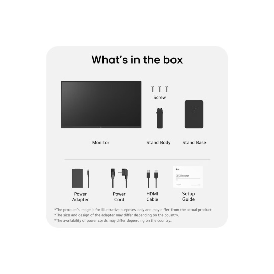 - Základňa stojana 2. Skrutky 3. Napájací adaptér 4. Napájací kábel 5. Kábel HDMI 6. Sprievodca nastavením