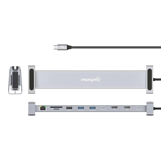 MANHATTAN Dokovací stanice USB-C 10v1, 2xHDMI, 2xUSB-C, 3xUSB, 1xRJ45, čtečka SD karet, šedá