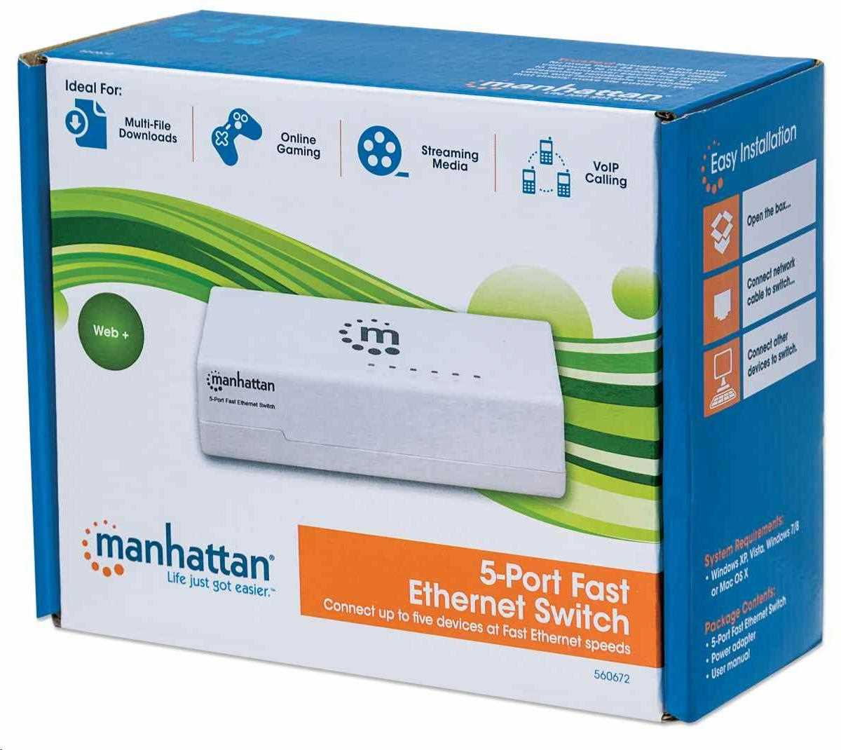 Manhattan 5portový prepínač Fast Ethernet je ideálny pre domáce prostredie a malé podniky, ktoré hľadajú odolný prepínač, ktorý je spoľahlivý a ľahko sa inštaluje.