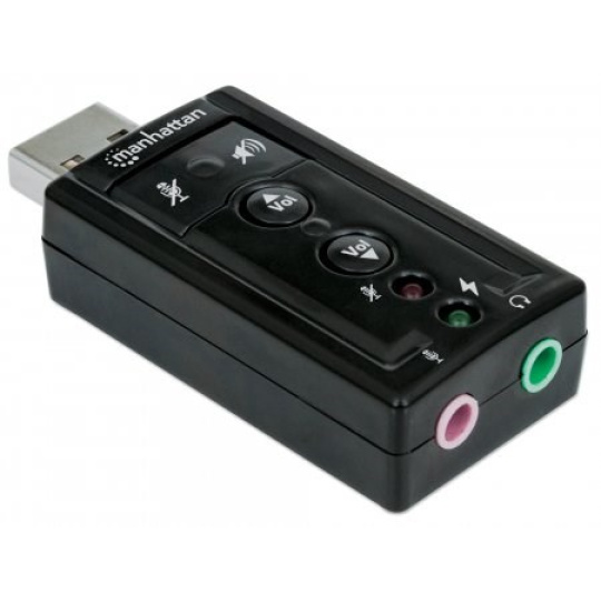 Ideálny pre stolové počítače, notebooky a netbooky, Manhattan Hi-Speed USB 3D 7.1 Zvukový adaptér okamžite vytvorí vstupné a výstupné porty pre mikrofón prostredníctvom ľubovoľného portu USB. Ľahko pripojte náhlavné súpravy, mikrofóny a reproduktory vybavené 3.5 mm káble, ktoré sú príliš krátke na to, aby pohodlne dosiahli na porty na nepohodlných alebo nevhodných miestach. Vďaka funkciám plug-and-play a hot-swap ľahko nahrádza nefunkčné zvukové karty, obchádza poškodené zvukové porty a zlepšuje prístup bez špeciálnych ovládačov alebo softvéru. Zabudovaný výkonový zosilňovač triedy B využíva napájanie zo zbernice USB, čím sa eliminuje potreba externých zdrojov energie alebo ďalších káblov. Podpora 3D zvuku a virtuálneho 7.1 priestorový zvuk a vstavané zvukové efekty s 10-pásmovým ekvalizérom poskytujú bohaté, vysokokvalitné zážitky so známym pohodlím a funkciami USB.