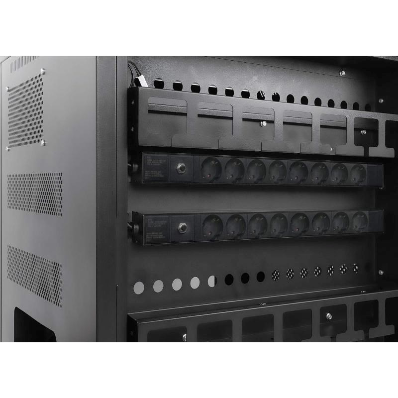 Vstavané AC zásuvky v PDU na zadnej strane jednotky uľahčujú nabíjanie zariadení, ako sú notebooky, tablety, telefóny a mnoho ďalších, pomocou ich napájacích adaptérov alebo stenných nabíjačiek. Správcovia majú pohodlný prístup cez dvierka na zadnej strane jednotky, aby sa mohli pripojiť do zásuviek a viesť káble ku zariadeniam v prednej časti.