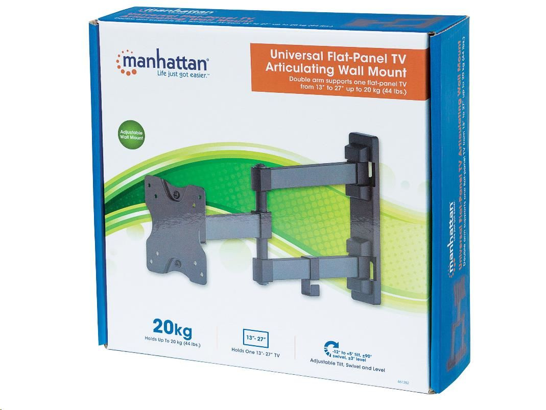 Prekonajte zvláštny pôdorys, nepríjemné oslnenie alebo nevhodné umiestnenie nábytku, ktoré môže obmedzovať zážitok z používania plochého televízora. Univerzálny nástenný držiak Manhattan na plochý televízor sa skladá takmer naplocho k stene a bezpečne sa vysúva na pevnom dvojramennom ráme, ktorý vám pomôže dosiahnuť vynikajúce pozície na sledovanie takmer z ktoréhokoľvek miesta v miestnosti. Tento kĺbový nástenný držiak je kompatibilný so štandardom VESA a je vyrobený z kvalitných materiálov, takže sa hodí pre rôzne veľkosti displejov a umožňuje bezpečnú a istú inštaláciu televízora nad podlahou. Perfektne sa hodí na montáž televízora v obývacej izbe, spálni alebo pracovni, ako aj na komerčné použitie v hoteloch, učebniach, konferenčných miestnostiach, na digitálnu reklamu a podobne. Univerzálny nástenný držiak na plochý televízor Manhattan prináša pôžitok z televízneho vysielania do popredia.