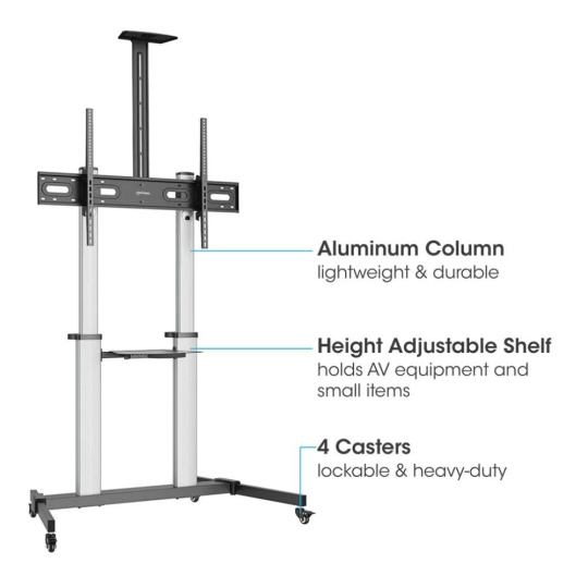 Prinesiete si televíziu k sebe. Keď ju budete potrebovať presunúť na iné miesto, ľahko ju tam premiestnite. Hliníkový multimediálny televízny vozík Manhattan s nastaviteľnou výškou umiestni televízor na kolieskach, takže ho budete môcť podľa potreby presúvať do rôznych priestorov, vyhnúť sa nepríjemnému oslneniu alebo prekonať obmedzujúce usporiadanie nábytku. Tento kvalitne spracovaný pojazdný televízny stojan, ktorý vyhovuje štandardu VESA a je vyrobený z kvalitných hliníkových materiálov, podporuje veľké televízory s uhlopriečkou až 100“ a unesie celkovú hmotnosť až 80 kg (176 libier). Tento pojazdný televízny vozík má všetky výhody nadpodlažnej inštalácie na stenu - zvýšený výhľad, profesionálnejší vzhľad, väčšiu bezpečnosť televízora atď. - a navyše mobilnú flexibilitu a nezávislosť.