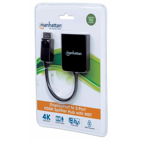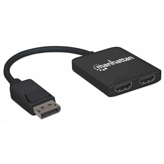 Rozbočovač Manhattan DisplayPort na duálny HDMI - MST prenáša signál 4K DisplayPort (DP) z jedného zdroja UHD až na dva displeje UHD HDMI.