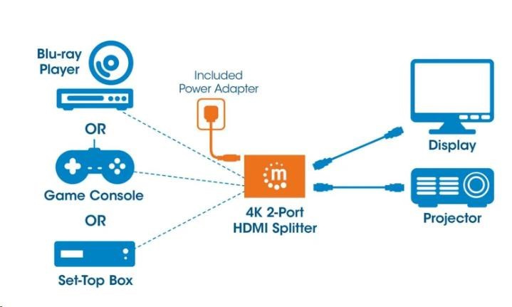 Manhattan 4K 2-portový rozdeľovač HDMI so zabudovaným zosilňovačom prenáša signál 4K HDMI z jedného zdroja UHD až na dva displeje UHD.