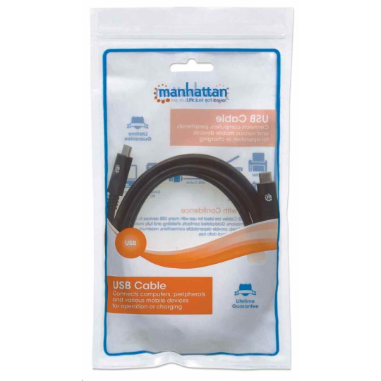 Káble Manhattan SuperSpeed USB typu C umožňujú jednoduché pripojenie periférnych zariadení a príslušenstva USB typu C k portom zariadení typu C. Tento kábel je ideálny na použitie s akýmkoľvek zariadením USB typu C typu plug-and-play a podporuje prenos dát rýchlosťou až 5 Gb/s v systémoch Windows a Mac pre rýchle a spoľahlivé prenosy a prúd až do 3 A. Poniklované kontakty, tienenie a plne tvarované pätky s odľahčením ťahu zabezpečujú spoľahlivé pripojenie, maximálnu vodivosť a minimálnu stratu dát pri zníženom rušení EMI.