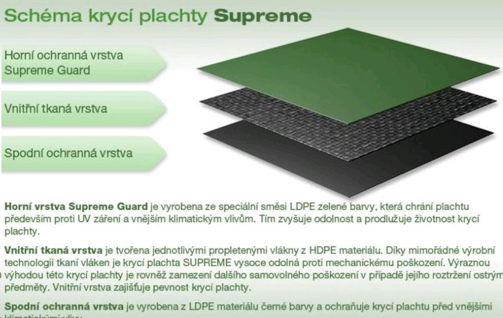 Vďaka použitiu ochranného vrstvy Supreme Guard je krycia plachta Supreme pevnejšia a lepšie odoláva poveternostným vplyvom – nejedná sa ale o zimnú plachtu a používanie pri teplotách pod bodom mrazu znižuje životnosť krycej plachty.