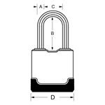 - Visací zámok šírky 48 mm s telom z laminovanej ocele s povrchovou úpravou odolnou voči poveternostným vplyvom.