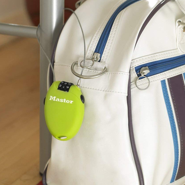 Závesný káblový zámok dĺžky 70 cm a priemeru 2 mm pre pevnosť a pružnosť; chránny vinylový poťah chrániaci pred poškriabaním; ľahko stiahnuteľný oceľový pletený kábel; tlačidlový mechanizmus umožňuje jednoduché spätné uloženie; mäkké dotykové krytie pre protišmykovú rukoväť; obsahuje 3-miestny resetovateľný zámok; odporúčané na ochranu batožiny, sedadiel a helmi.
