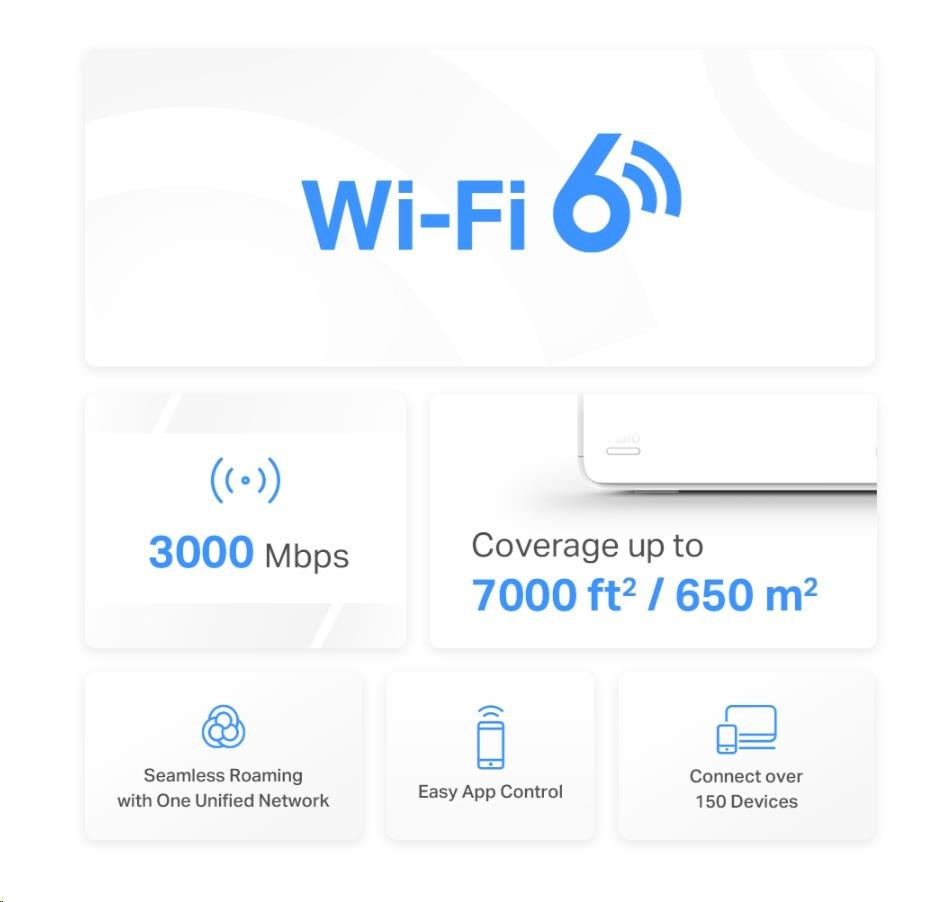 - Dvoupásmové Wi-Fi 6 pripojenie s rýchlosťou až 3 000 Mbit/s – 2 402 Mbit/s v pásme 5 GHz + 574 Mbit/s v pásme 2,4 GHz.