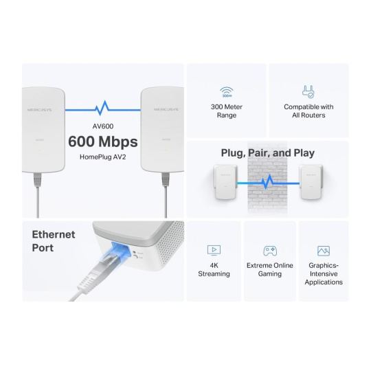 - 600 Mbps vysokorýchlostný prenos: Rýchly a stabilný prenos vďaka pokročilej technológii HomePlug AV2‡