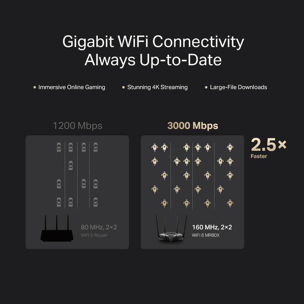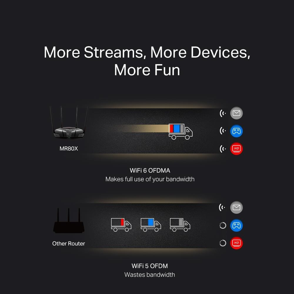 - Viac zariadení, viac zábavy – podporuje technológie MU-MIMO a OFDMA, ktoré znižujú zahltenie siete a štvornásobne zvyšujú priemernú priechodnosť.