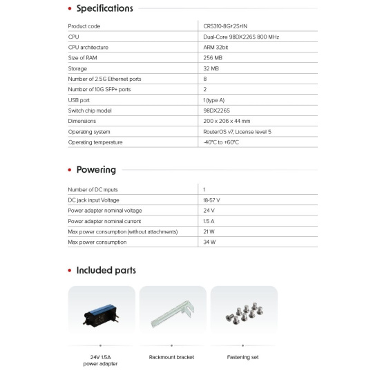 ndoor 10-portový switch s 8x RJ45 2,5Gbps porty a 2x 10G SFP+ porty. Vše se zrychluje a dokonce i malé kanceláře přecházejí z gigabitového připojení na rychlejší 2,5gigabitové připojení. Model CRS310-8G+2S+IN vám nabízí řešení integrující kombinaci osmi 2,5 Gbps ethernet portů a dvou 10Bgps portů SFP+ v kompaktním a výkonném prvku. Šachty SFP+ podporují více rychlostí přenosu dat: 1GB, 2,5GB a 10GB. V případě potřeby tedy můžete tento přepínač použít jako 10x 2,5G přepínač. Nové výkonné přepínací čipy Marvell v kombinaci s ROS v7 Switch čip Marvell 98DX226S a integrovaný dvoujádrový procesor ARM zvládnou plný potenciál systému RouterOS v7. Kofigurace sítí VLAN, rámce Jumbo, agregaci linek, pravidla ACL a mnoho dalšího. Můžete dokonce provádět hardware offloaded routování na na L3. Instalační variabilita Switch skýtá více možností montáže, lze jej snadno nainstalovat do standardního 19" racku pomocí dodávaných uší pro montáž do racku. Další možností je pořídit si sadu příslušenství RMK-2/10, umožňující montáž dvou jednotek CRS310 do stejného 19" racku o výšce 1U nebo je namontovat do 10" racku. Součástí balení je příslušenství k montáži do racku a 24V 1.5A napájecí adaptér. Základní technické specifikace: Product code: CRS310-8G+2S+IN CPU: Dual-Core 98DX226S 800 MHz CPU architecture: ARM 32bit Size of RAM: 256 MB Storage: 32 MB Number of 2.5G Ethernet ports: 8 Number of 10G SFP+ ports: 2 USB port: 1 (type A) Switch chip model: 98DX226S Dimensions: 200 x 206 x 44 mm Operating system: RouterOS v7, License level 5 Operating temperature: -40°C to +60°C Napájení: Number of DC inputs: 1 DC jack input Voltage: 18-57 V Power adapter nominal voltage: 24 V Power adapter nominal current: 1.5 A Max power consumption (without attachments): 21 W Max power consumption: 34 W.