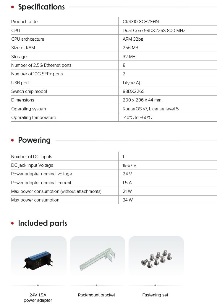 ndoor 10-portový switch s 8x RJ45 2,5Gbps porty a 2x 10G SFP+ porty. Vše se zrychluje a dokonce i malé kanceláře přecházejí z gigabitového připojení na rychlejší 2,5gigabitové připojení. Model CRS310-8G+2S+IN vám nabízí řešení integrující kombinaci osmi 2,5 Gbps ethernet portů a dvou 10Bgps portů SFP+ v kompaktním a výkonném prvku. Šachty SFP+ podporují více rychlostí přenosu dat: 1GB, 2,5GB a 10GB. V případě potřeby tedy můžete tento přepínač použít jako 10x 2,5G přepínač. Nové výkonné přepínací čipy Marvell v kombinaci s ROS v7 Switch čip Marvell 98DX226S a integrovaný dvoujádrový procesor ARM zvládnou plný potenciál systému RouterOS v7. Kofigurace sítí VLAN, rámce Jumbo, agregaci linek, pravidla ACL a mnoho dalšího. Můžete dokonce provádět hardware offloaded routování na na L3. Instalační variabilita Switch skýtá více možností montáže, lze jej snadno nainstalovat do standardního 19" racku pomocí dodávaných uší pro montáž do racku. Další možností je pořídit si sadu příslušenství RMK-2/10, umožňující montáž dvou jednotek CRS310 do stejného 19" racku o výšce 1U nebo je namontovat do 10" racku. Součástí balení je příslušenství k montáži do racku a 24V 1.5A napájecí adaptér. Základní technické specifikace: Product code: CRS310-8G+2S+IN CPU: Dual-Core 98DX226S 800 MHz CPU architecture: ARM 32bit Size of RAM: 256 MB Storage: 32 MB Number of 2.5G Ethernet ports: 8 Number of 10G SFP+ ports: 2 USB port: 1 (type A) Switch chip model: 98DX226S Dimensions: 200 x 206 x 44 mm Operating system: RouterOS v7, License level 5 Operating temperature: -40°C to +60°C Napájení: Number of DC inputs: 1 DC jack input Voltage: 18-57 V Power adapter nominal voltage: 24 V Power adapter nominal current: 1.5 A Max power consumption (without attachments): 21 W Max power consumption: 34 W.