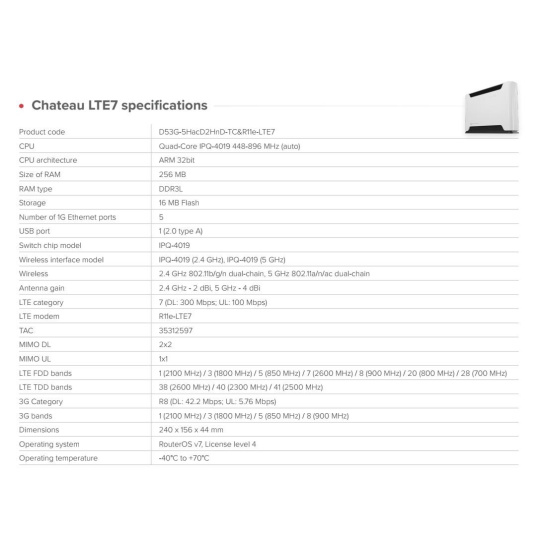 Univerzální domácí router s novým modemem CAT7 a rychlým čtyřjádrovým procesorem pro všechny úkoly související s bezpečností a správou domácí sítě. Dvoupásmové Wi-Fi s duálním řetězcem, 5 gigabitových portů a plná výbava operačního systému RouterOS v7 Ideální pro bezpečné připojení VPN, domácí kanceláře nebo sítě malých podniků, které kladou důraz na funkčnost i estetiku. Skvělý prvek jak v rukou zkušených správců systémů, tak v domácnosti pro uživatele bez jakýchkoli IT znalostí. Proč upgradovat na CAT7? • Dvojnásobná rychlost uploadu • Rozšířená podpora frekvencí – nyní zahrnuje pásmo 32 (1500 MHz) pro ještě lepší výkon v přetížených oblastech. • Stejný osvědčený design – žádné změny v instalaci nebo konfiguraci. • Nižší náklady – lepší konektivita, která ve skutečnosti stojí méně. Všechna nová zařízení CAT7 také podporují 2×2 MIMO DL a agregaci pásem. To znamená, že mohou současně využívat více pásem LTE. To je obrovská výhoda, když je v dané oblasti mnoho mobilních uživatelů. Nabízí lepší odezvu v přeplněném prostředí, vyšší účinnost v situacích se slabším signálem. Po zapnutí agregace pásem jsme zaznamenali zdvojnásobení rychlosti internetu ve venkovských oblastech. Chateau LTE7 je vysokorychlostní dvoupásmový domácí přístupový bod, který se přizpůsobí vašim potřebám Chateau je navržen tak, aby sloužil nejrůznějším skupinám uživatelů: od profesionálů v oblasti IT, kteří jej mohou využít až na hranici svých možností, po běžné domácnosti. K připojení všech domácích zařízení (mediálních serverů) je připraven 5x gigabitový ethernetový port (PC věže, televizory). Můžete si také ponechat LTE jako zálohu a použít gigabitový Ethernet k připojení k poskytovateli internetu pro ještě vyšší rychlosti. Konec úzkých hrdel v podobě nízkokapacitních domácích routerů Mnoho domácností je omezeno levnými routery bez LTE funkcí, které jednoduše nezvládají nároky moderního využívání internetu. Řešením je Chateau. Svobodně kdekoliv s LTE Dosáhněte konzistentní rychlosti až 300 Mb/s díky agregaci nosných sítí, protože CAT6 umožňuje zařízením využívat více pásem současně. Chateau LTE6 poskytuje lepší odezvu v přeplněném prostředí a vyšší účinnost v situacích se slabším signálem mimo městské aglomerace. Vlastnosti Chateau je vybaven všemi pokročilými funkcemi RouterOS, takže získáte řešení podnikové úrovně za cenu spotřebitelské třídy. • využívejte zabezpečenou síť VPN z kanceláře přímo k vám domů • povolte nejrůznější druhy rodičovské kontroly • ponořte se do specifických pravidel brány firewall a hardwarové akcelerace IPsec • nakonfigurujte sítě VLAN, nastavte e-mailová nebo SMS upozornění • můžete automatizovat složitá spouštěcí oznámení (např: "VAROVÁNÍ!" pokud šířka pásma dosáhla hodnoty X po dobu trvání Y!) Podpora nasazení mobilními operátory Chateau podporuje technologii TR-069, která umožňuje vytvářet vlastní možnosti vzdálené správy klientů. Nejjednodušší a nejzákladnější nastavení routeru můžete mít na stejné webové stránce, kterou používáte k placení mobilního účtu. Technické specifikace: Product code: D53G-5HacD2HnD-TC&R11e-LTE7 CPU: Quad-Core IPQ-4019 448-896 MHz (auto) CPU: architecture ARM 32bit Size of RAM: 256 MB RAM type: DDR3L Storage: 16 MB Flash Number of 1G Ethernet ports: 5 USB port: 1 (2.0 type A) Switch chip model: IPQ-4019 Wireless interface model: IPQ-4019 (2.4 GHz), IPQ-4019 (5 GHz) Wireless: 2.4 GHz 802.11b/g/n dual-chain, 5 GHz 802.11a/n/ac dual-chain Antenna gain: 2.4 GHz - 2 dBi, 5 GHz - 4 dBi LTE category: 7 (DL: 300 Mbps; UL: 100 Mbps) LTE modem: R11e-LTE7 TAC: 35312597 MIMO DL: 2x2 MIMO UL: 1x1 LTE FDD bands: 1 (2100 MHz) / 3 (1800 MHz) / 5 (850 MHz) / 7 (2600 MHz) / 8 (900 MHz) / 20 (800 MHz) / 28 (700 MHz) LTE TDD bands: 38 (2600 MHz) / 40 (2300 MHz) / 41 (2500 MHz) 3G Category: R8 (DL: 42.2 Mbps; UL: 5.76 Mbps) 3G bands: 1 (2100 MHz) / 3 (1800 MHz) / 5 (850 MHz) / 8 (900 MHz) Dimensions: 240 x 156 x 44 mm Operating system: RouterOS v7, License level 4 Operating temperature: -40°C to +70°C Napájení: Number of DC inputs: 1 DC jack input Voltage: 12-28 V Power adapter nominal voltage: 24 V Power adapter nominal current: 1.2 A Max power consumption without attachments: 16 W Max power consumption: 21 W Upozornění Výrobce Mikrotik neposkytuje záruku na zařízení poškozená přepětím. Zařízení je třeba adekvátně chránit proti indukovanému elektrostatickému přepětí či přepěťovým špičkám na silovém vedení. Pro venkovní instalace používat výhradně stíněnou kabeláž (FTP/SFTP), jednotky korektně uzemnit (užití integrovaného zemnícího členu, ethernetové přepěťové ochrany). Zařízení vždy provozujte s poslední výrobcem publikovanou verzí (výrobcem označenou "Stable") operačního systému RouterOS. Taková verze garantuje nejoptimálnější funčknost, obsahuje opravené chyby z verzí předchozích a výkonová vylepšení..