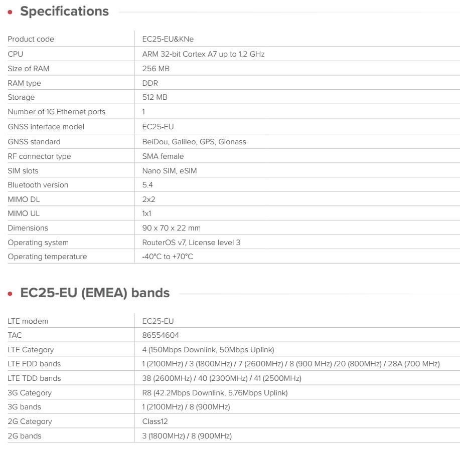Brána IoT průmyslové třídy s LTE/BLE/GNSS konektivitou pro inteligentní sledování majetku, vzdálené monitorování a efektivní automatizaci. Původně navrženo pro kávovary a prodejní automaty – ideální pro všechny druhy průmyslové automatizace. KNOT Embedded LTE4 je malá, ale výkonná průmyslová LTE brána určená pro integrátory, specialisty na automatizaci a tvůrce systémů IoT. Hodí se do stísněných prostor, montuje se přímo na DIN lištu a poskytuje spolehlivé připojení LTE Cat4 s podporou Bluetooth a GNSS. Použijte ji jako primární bránu, záložní spojení nebo uzel pro sběr dat IoT – vše je poháněno systémem RouterOS pro maximální flexibilitu. Funkce a vlastnosti KNOT Embedded LTE4 je určen pro prostředí, kde je omezený prostor, ale spolehlivost je zásadní: • Infrastruktura inteligentních měst (parkování, senzory, měření) • Monitorování kávovarů a prodejních automatů • Skříně pro průmyslovou automatizaci • Monitorování životního prostředí a veřejných služeb • Sledování vozidel nebo majetku pomocí GNSS • Prodejní kiosky, platební terminály, digitální značení • Záložní připojení LTE pro stávající zařízení Ethernet • Brány IoT pro senzory a majáky BLE Upozornění: IoT brána není plnohodnotným LTE routerem. SIM karta není určená pro vytáčení připojení, ale pro komunikaci v síti IoT. IoT brána nedisponuje LTE modemem. Technické specifikace: Product code: EC25-EU&KNe CPU: ARM 32-bit Cortex A7 up to 1.2 GHz Size of RAM: 256 MB RAM type: DDR Storage: 512 MB Number of 1G Ethernet ports: 1 GNSS interface model: EC25-EU GNSS standard: BeiDou, Galileo, GPS, Glonass RF connector type: SMA female SIM slots: Nano SIM, eSIM Bluetooth version: 5.4 MIMO DL: 2x2 MIMO UL: 1x1 Dimensions: 90 x 70 x 22 mm Operating system: RouterOS v7, License level 3 Operating temperature: -40°C to +70°C Napájení: Number of DC inputs: 2 (PoE-In, USB Type-C (powering only)) PoE-In input Voltage: 12-57 V USB Type-C input voltage: 5 V Power adapter nominal voltage: 5 V Power adapter nominal current: 0.8 A PoE-in: 802.3af/at Max power consumption: 7 W EC25-EU (EMEA) podporovaná pásma: LTE modem: EC25-EU TAC: 86554604 LTE Category: 4 (150Mbps Downlink, 50Mbps Uplink) LTE FDD bands: 1 (2100MHz) / 3 (1800MHz) / 7 (2600MHz) / 8 (900 MHz) /20 (800MHz) / 28A (700 MHz) LTE TDD bands: 38 (2600MHz) / 40 (2300MHz) / 41 (2500MHz) 3G Category: R8 (42.2Mbps Downlink, 5.76Mbps Uplink) 3G bands: 1 (2100MHz) / 8 (900MHz) 2G Category: Class12 2G bands: 3 (1800MHz) / 8 (900MHz) Internet věcí (anglicky Internet of Things, zkratka IoT) je termínem pro moderní přístroje ovladatelné i na dálku pomocí internetu. Snadno je tak obsloužíte pomocí svého chytrého telefonu nebo je jednoduše připojíte k centrální jednotce. Umožní tak snadno zautomatizovat věci, o které byste se jinak museli postarat sami. Jedná se o technologický koncept umožňující realizaci takzvaného "inteligentního domu" (automatické zhasínání světel, ovládání vytápění apod.). Umožňuje řídit klimatizaci, vyhřívání vašeho bazénu, ohřev vody, pečovat o vaše akvárium, obsluhovat nastavení alarmu či mechanických zámků. Pokud si nejste jistí, zda jste v ranním shonu vypnuli žehličku, můžete na dálku odpojit od sítě jednotlivé zásuvky. Vaše lednička vás dokáže upozornit na chybějící potraviny a připravovat aktualizovaný nákupní seznam. Upozornění Výrobce Mikrotik neposkytuje záruku na zařízení poškozená přepětím. Zařízení je třeba adekvátně chránit proti indukovanému elektrostatickému přepětí či přepěťovým špičkám na silovém vedení. Pro venkovní instalace používat výhradně stíněnou kabeláž (FTP/SFTP), jednotky korektně uzemnit (užití integrovaného zemnícího členu, ethernetové přepěťové ochrany). Zařízení vždy provozujte s poslední výrobcem publikovanou verzí (výrobcem označenou "Stable") operačního systému RouterOS. Taková verze garantuje nejoptimálnější funčknost, obsahuje opravené chyby z verzí předchozích a výkonová i funční vylepšení.Taková verze garantuje nejoptimálnější funčknost, obsahuje opravené chyby z verzí předchozích a výkonová vylepšení. .