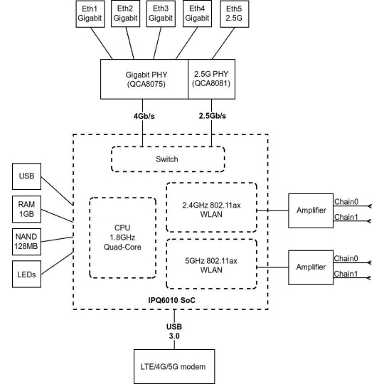 Popis produktu Chateau LTE18 ax je Dual Band 2.4/5GHz Wi-Fi 6 router do domácnosti či malých firem s (4) Gigabit LAN + (1) 2.5-Gigabit porty, LTE18 modemem, jedním USB portem, L4 licencí a extra rychlým 4-jádrovým ARM CPU s taktem 1800 MHz, vnitřním uložištěm 128 MB a 1 GB RAM. Uživatel tak může souběžně používat 2.4GHz kanál pro asociovaná mobilní bezdrátová zařízení a 5GHz kanál mít vyhrazen např. pro TV streamování videa. Modulační rychlost 2.4GHz rádiové části (2x2 MIMO) je 574 Mbps a pro 5GHz (2x2 MIMO) je to 1200 Mbps. Chateau LTE18 ax disponuje čtyřmi vestavěnými anténami pro LTE, dvěmi SMA female konektory pro případný vylepšení LTE dosahu pomocí externích antén a dvěmi anténami pro Wi-Fi, které jsou součástí balení. V případě modelu Chateau LTE18 ax již nadále nemusíte být limitováni kabeláží - výhodou tohoto modelu je velmi široká podpora kanálů v 3G/LTE sítí. Tento LTE router poskytuje rychlost až 1 200 Mbps (download) a 150 Mbps upload s nízkými latencemi v LTE. Obsah balení Zařízení (2) Wi-Fi anténa Napájecí adaptér 24V / 1.2A UTP patch kabel - 1,5m Technické parametry Bezdrátové vlastnosti Bezdrátové frekvence:2.4 + 5 GHz (dual band), 3G (GSM), LTE WiFi standardy:802.11ax, 802.11ac, 802.11n, 802.11a, 802.11b/g Přenosová rychlost - 5GHz [Mb/s]:1201 Přenosová rychlost - 2.4GHz [Mb/s]:574 Vysílací výkon 2.4GHz [dBm]:20 Vysílací výkon 5GHz [dBm]:21 Šifrování:WPA, WPA2, WPA3 2.4GHz MIMO:2 x 2 5GHz MIMO:2 x 2 Typ antény:Vestavěná, Odnímatelná Počet vestavěných antén:4 Počet odnímatelných antén:4 Zisk antény [dBi]:3, 6 Integrovaná 4G/LTE rádiová část:Ano Podporované 4G/LTE kanály:(1) 2100 MHz, (3) 1800 MHz, (5) 850 MHz, (7) 2600 MHz, (8) 900 MHz, (20) 800 MHz, (28) 700 MHz, (38) 2600 MHz, (40) 2300 MHz, (41) 2500 MHz Konektory a rozhraní Počet portů USB 2.0:1 VF konektory:(2) RSMA female, (2) SMA female Rychlost LAN:(1) 1G/2.5Gbps + (4) 10/100/1000Mbps Gigabit LAN:Ano Slot na SIM kartu:Ano Počet SIM slotů:1 USB:Ano Napájení Max. spotřeba energie [W]:16 Napájení přes konektor/svorkovnici:12 .. 28V DC Fyzické charakteristiky Provedení:Desktop Použití:Vnitřní Tlačítka:Reset, mód Provozní teplota [°C]:-40 až 65 Šířka [mm]:240 Výška [mm]:156 Hloubka [mm]:44 Hardware CPU:IPQ-6010 Frekvence CPU [MHz]:1800 Počet CPU jader:4 Interní uložiště [MB]:128 RAM [MB]:1024 Software Operační mód:AP Router, Access Point, 3G/4G Router Operační systém:RouterOS - L4 Podpora IPv6:Ano Výchozí IP adresa:192.168.88.1 Výchozí jméno a heslo:admin / -.