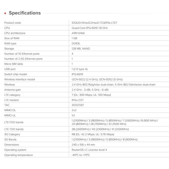 Chateau LTE7 ax si zachovává stejný výkonný hardware, elegantní design a výkon Wi-Fi 6. Nyní navíc nabízí modem LTE kategorie 7, rozšířenou podporu frekvencí a nižší cenu než předchozí verze LTE6 ax. Výkonný LTE router pro náročné sítě Chateau LTE7 ax kombinuje nový modem R11e-LTE7 s čtyřjádrovým procesorem ARM, 1 GB RAM, dvoupásmovým bezdrátovým připojením Wi-Fi 6 (802.11ax) a 2,5gigabitovým ethernetovým portem pro ultrarychlé lokální připojení. Umožňuje spuštění více zabezpečených VPN tunelů, pokročilá pravidla firewallu, pokročilá nastavení kontejnerů nebo složité scénáře směrování – to vše při rychlejším a spolehlivějším mobilním připojení. Ať už je LTE vaším primárním připojením nebo spolehlivou zálohou pro optické připojení, Chateau LTE7 ax se snadno přizpůsobí vašemu nastavení. Ideální pro domácí kanceláře, firmy a poskytovatele internetových služeb S pěti ethernetovými porty (včetně portu 2,5G!), 2×2 MIMO LTE a plnou funkčností RouterOS v7. Chateau LTE7 ax se hodí pro širokou škálu použití: • Zabezpečení domácích kanceláří a práce na dálku. • Malé a střední podniky. • Nasazení LTE nebo hybridních ISP. • Domácnosti, které vyžadují výkon a čistý design. Proč upgradovat na CAT7? • Dvojnásobná rychlost uploadu • Rozšířená podpora frekvencí – nyní zahrnuje pásmo 32 (1500 MHz) pro ještě lepší výkon v přetížených oblastech. • Stejný osvědčený design – žádné změny v instalaci nebo konfiguraci. • Nižší náklady – lepší konektivita, která ve skutečnosti stojí méně. Všechna nová zařízení CAT7 také podporují 2×2 MIMO DL a agregaci pásem. To znamená, že mohou současně využívat více pásem LTE. To je obrovská výhoda, když je v dané oblasti mnoho mobilních uživatelů. Nabízí lepší odezvu v přeplněném prostředí, vyšší účinnost v situacích se slabším signálem. Po zapnutí agregace pásem jsme zaznamenali zdvojnásobení rychlosti internetu ve venkovských oblastech. Vlastnosti Chateau je vybaven všemi pokročilými funkcemi RouterOS, takže získáte řešení podnikové úrovně za cenu spotřebitelské třídy. • využívejte zabezpečenou síť VPN z kanceláře přímo k vám domů • povolte nejrůznější druhy rodičovské kontroly • ponořte se do specifických pravidel brány firewall a hardwarové akcelerace IPsec • nakonfigurujte sítě VLAN, nastavte e-mailová nebo SMS upozornění • můžete automatizovat složitá spouštěcí oznámení (např: "VAROVÁNÍ!" pokud šířka pásma dosáhla hodnoty X po dobu trvání Y!) Podpora nasazení mobilními operátory Chateau podporuje technologii TR-069, která umožňuje vytvářet vlastní možnosti vzdálené správy klientů. Nejjednodušší a nejzákladnější nastavení routeru můžete mít na stejné webové stránce, kterou používáte k placení mobilního účtu. Technické specifikace: Product code: S53UG+5HaxD2HaxD-TC&R11e-LTE7 CPU: Quad-Core IPQ-6010 1.8 GHz CPU architecture: ARM 64bit Size of RAM: 1 GB RAM type: DDR3L Storage: 128 MB, NAND Number of 1G Ethernet ports: 4 Number of 2.5G Ethernet ports: 1 Micro SIM slots: 1 USB port: 1 (2.0 type A) Switch chip model: IPQ-6010 Wireless interface model: QCN-5022 (2.4 GHz), QCN-5052 (5 GHz) Wireless: 2.4 GHz 802.11b/g/n/ax dual-chain, 5 GHz 802.11a/n/ac/ax dual-chain Antenna gain: 2.4 GHz - 3 dBi, 5 GHz - 6 dBi LTE category: 7 (DL: 300 Mbps; UL: 100 Mbps) LTE modem: R11e-LTE7 TAC: 35312597 MIMO DL: 2x2 MIMO UL: 1x1 LTE FDD bands: 1 (2100MHz) / 3 (1800MHz) / 5 (850MHz) / 7 (2600MHz) / 8 (900 MHz) / 20 (800MHz) / 28 (700MHz) / 32 (1500 MHz) LTE TDD bands: 38 (2600MHz) / 40 (2300MHz) / 41 (2500MHz) 3G Category: R8 (DL: 42.2 Mbps; UL: 5.76 Mbps) 3G Bands: 1 (2100MHz) / 3 (1800MHz) / 5 (850MHz) / 8 (900MHz) Dimensions: 240 x 156 x 44 mm Operating system: RouterOS v7, License level 4 Operating temperature: -40°C / +70°C Napájení: Number of DC inputs: 1 DC jack input Voltage: 12-28 V Power adapter nominal voltage: 24 V Power adapter nominal current: 1.2 A Max power consumption without attachments: 15.5 W Max power consumption: 21.5 W Upozornění Výrobce Mikrotik neposkytuje záruku na zařízení poškozená přepětím. Zařízení je třeba adekvátně chránit proti indukovanému elektrostatickému přepětí či přepěťovým špičkám na silovém vedení. Pro venkovní instalace používat výhradně stíněnou kabeláž (FTP/SFTP), jednotky korektně uzemnit (užití integrovaného zemnícího členu, ethernetové přepěťové ochrany). Zařízení vždy provozujte s poslední výrobcem publikovanou verzí (výrobcem označenou "Stable") operačního systému RouterOS. Taková verze garantuje nejoptimálnější funčknost, obsahuje opravené chyby z verzí předchozích a výkonová vylepšení..